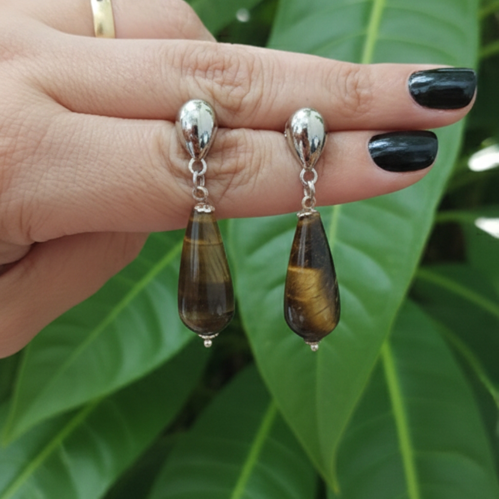 Feito à mão com Olho de Tigre, esse brinco é conhecido por sua energia de força e proteção, auxiliando na estabilidade emocional, no fortalecimento da autoconfiança e na clareza mental. Associado ao Chakra do Plexo Solar, o Olho de Tigre estimula coragem, determinação e a capacidade de agir com consciência e firmeza.