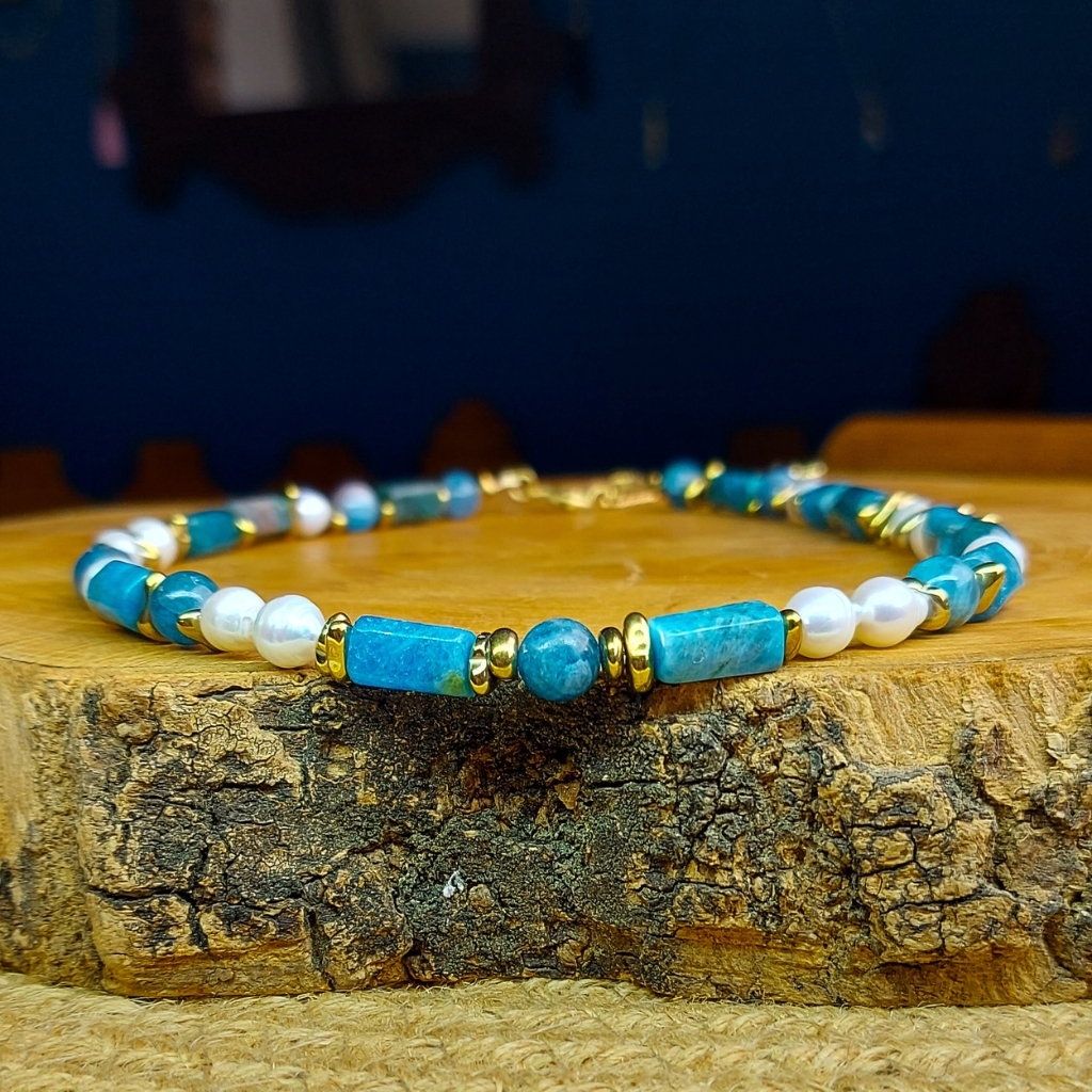 Feito à mão com Apatita natural, detalhes em Pérolas e Hematitas, esse colar une a energia da expressão verdadeira com o acolhimento emocional e a força do aterramento, uma combinação ideal para quem deseja falar, agir e se posicionar com mais consciência e presença.