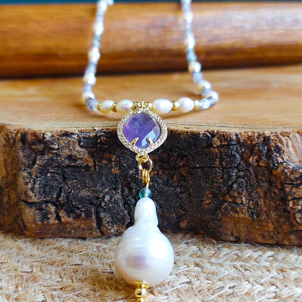 O Colar Longo de Fluorita com Pérolas e Pingente de Ametista foi criado para quem busca clareza mental, equilíbrio emocional e elevação espiritual, mesmo em meio à rotina intensa.