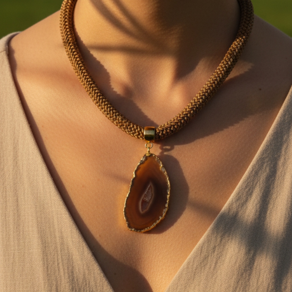 O Colar em Crochê com Chapa de Ágata – Parceria La Nonna Crochê foi criado para quem busca equilíbrio emocional, originalidade e conexão com o feito à mão em meio à rotina e aos desafios cotidianos.