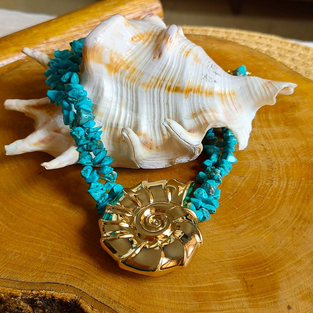 O Colar de Turquesa com Concha foi criado para quem busca proteção energética, equilíbrio emocional e uma conexão profunda com a energia do mar, da intuição e do feminino sagrado.