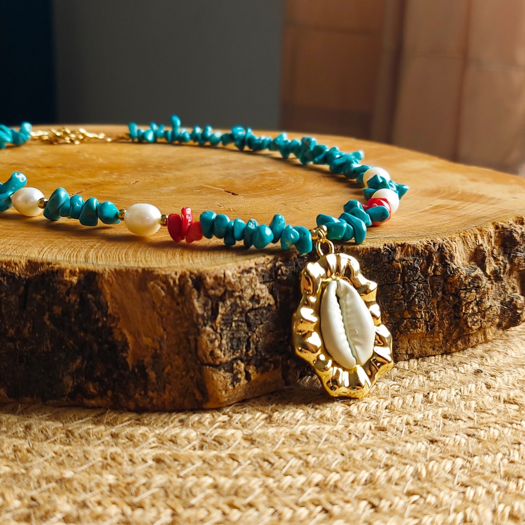 Feito à mão com Turquesa natural, esse colar é conhecido por sua energia protetora e harmonizadora, auxiliando no equilíbrio das emoções, na comunicação consciente e na purificação do campo energético. As pérolas acrescentam suavidade, sabedoria emocional e conexão com o feminino, enquanto o pingente de búzios simboliza proteção espiritual, prosperidade e ligação com as forças ancestrais do mar.