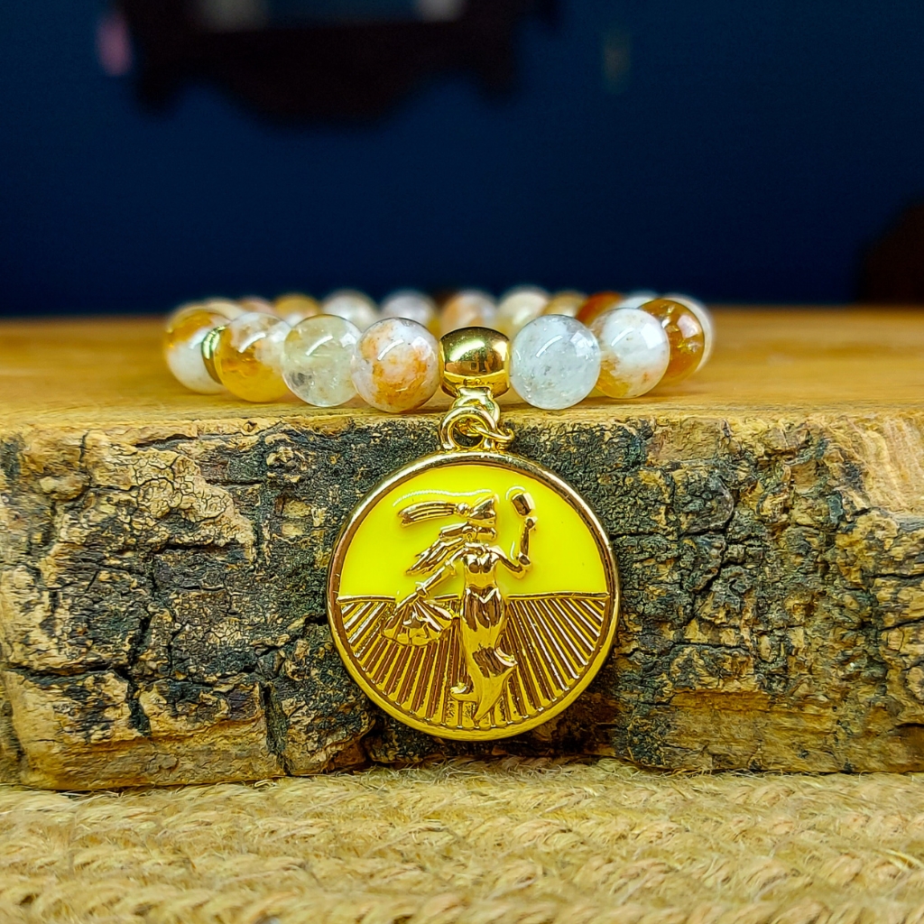 Feita à mão com Citrino natural, cristal associado à prosperidade e à energia solar de Oxum, essa pulseira irradia alegria, confiança e vitalidade. Ela auxilia no fortalecimento da autoestima, na liberação de bloqueios emocionais e na ativação do fluxo da prosperidade material e emocional, trazendo mais leveza e brilho para o dia a dia.